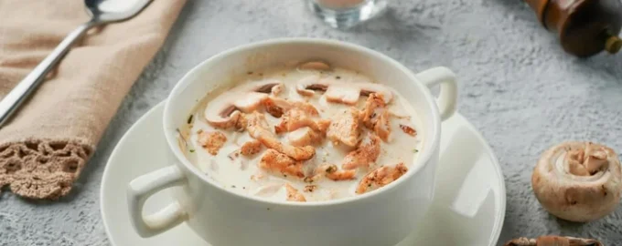 - تريل ڀاڄيون مشروم سان گڏ هڪ ساسپين ۾ رکو، لوڻ ۽ مرچ شامل ڪريو. جڙي ٻوٽي شامل ڪريو، گرميء کي بند ڪريو ۽ 10 منٽن لاء ڍڪ ڍڪيو. اڇي ماني کي ڪعب ۾ ڪٽيو ۽ تندور ۾ يا سڪل فرائينگ پين ۾ سڪي ڇڏيو. جيڪڏهن توهان پروسيس ٿيل پنير سان ڪريم سوپ تيار ڪري رهيا آهيو، پوء ان کي بلينڈر سان صاف ڪريو. ڪڪڙ ۽ ڪٽيل جڙي ٻوٽين سان گڏ خدمت ڪريو.
